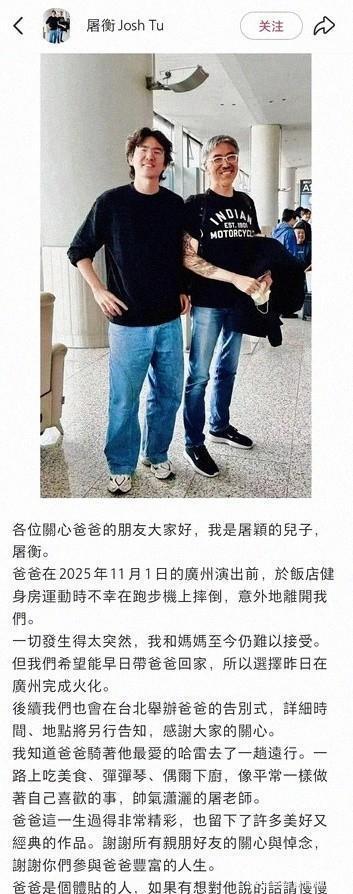 这不是一条冷冰冰的意外新闻,它逼着人去想两个现实问题,习以为常的运动如何变成风险,舞台背后的人被看见的方式又是否太迟先把时间线摆清日上点,他在社交平台晒出自己在跑步机上的照片,并分享了广州的晨跑数据与当地小吃,状态热络,像往常一样热爱吃、爱动、爱更日下点,齐豫“风采依旧在”广州演唱会主办方发布紧急公告,以团队成员突发意外为由宣布延期,未点名谁出事,外界一时摸不着头绪当天夜里,制作人陈子鸿发出一句“45年的老友,屠颖老师一路好走”,第一次把事态定格在最坏的可日,歌手黄安在社交平台补充细节,称屠颖在酒店跑步机跑步时摔跤,头部撞地造成颅内出血去世措辞克制,但后果清日,家人在广州完成火化,随后低调离日晚,屠衡发声明确认父亲意外离世,感谢关心,并告知后续将在台北举行告别式儿子的文字里没有渲染悲伤,只往前做实事,先把父亲接回家,再谈告别声明里有一句想象的寄语,既贴着生活又像一封家书,他写父亲好像骑着最爱的哈雷去远行,路上吃美食,弹琴,下厨,还是那个潇洒的屠老师截日,台北告别式的具体时间和地点仍未公布,他的社交平台已成为悼念与回忆的留言墙一个把两千多首流行金曲织进大众记忆的人离开了,行业与公众不该只记住悲伤,更该看见幕后价值与运动安全的年生,1987年入行,他从键盘手做起,三十八年里把手艺铺陈成一部华语流行的编年年,他凭江淑娜《我是个不喜欢热闹的人》拿到届台湾金曲奖最佳编曲,这是职业生涯的第一块里程碑此后持续入围与获奖,2002年入围金曲奖最佳编曲,2003年获香港TVB8金曲奖最佳编曲,2009年又以作曲身份获得金曲奖提名,专业认可密集而稳固作品的跨度广,性质却精准张学友《忘记你我做不到》,钢琴与弦乐推进情绪的层次;张信哲《过火》,配器把遗憾延长到每个停顿;